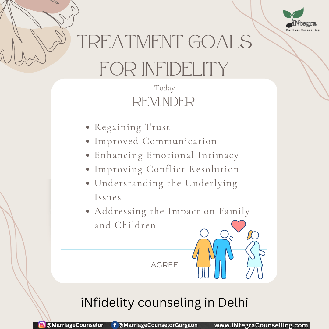 The ultimate goal of infidelity counseling is to help the couple repair their relationship and find a way forward. Some of the specific goals of infidelity counseling may include:Treatment Goals for Infidelity -iNfidelity counselling in Delhi - iNfidelity Recovery Counsellor in Delhi Gurgaon Goa Noida